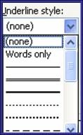 Underline : با این فرمان تعیین می کنید که هیچ خطی زیر کلمات نباشد، یا یک خط تنها، یک خط دوبل، و یا خطوط متفاوت دیگر زیر کلمه ها قرار گیرد.