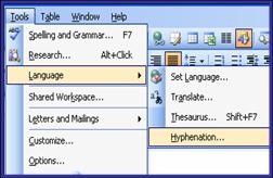- از زیر منوی نمایش داده شده فرمان Hyphenation را انتخاب کنید تا کادر محاوره ای آن باز شود.