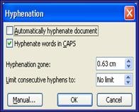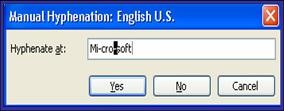 از منوی Tools فرمان Hyphenation را انتخاب کنید تا کادر محاوره ای آن باز شود. روی دکمه Manual کلیک کنید تا کادر محاوره ای دیگری به شکل روبرو باز شود. سپس مابین کلمه ها فاصله است که در صورت دلخواه شخص با فشردن Yes فاصله گذاری می شود.