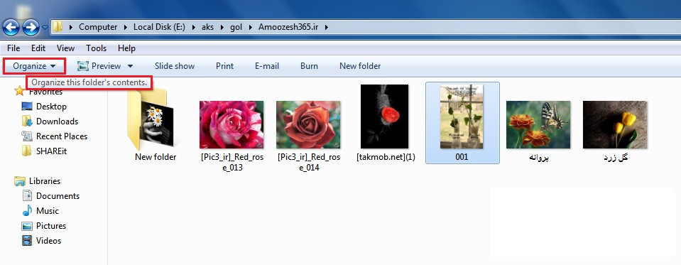 بر روی سربرگ Organize کلیک چپ می کنیم.