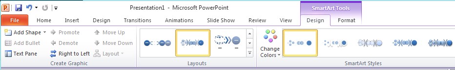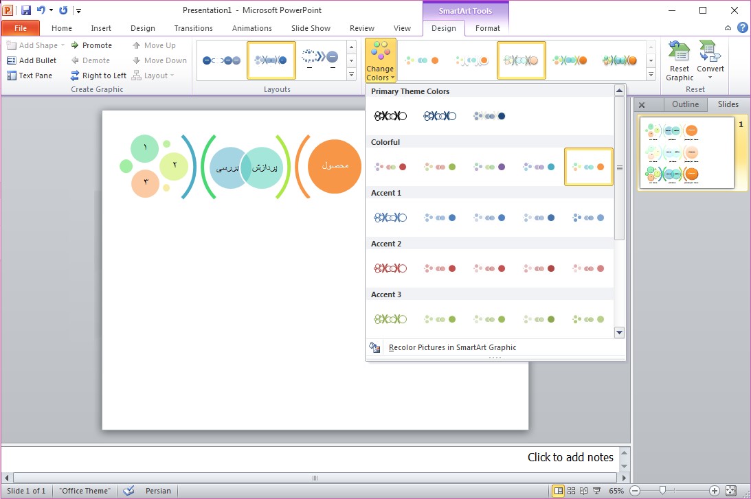 پس از انتخاب شکل مورد نظر، منوی پنهانی با عنوان SmartArt Tools ظاهر می شود که می توان تغییراتی در شکل مورد نظر اعمال کرد.