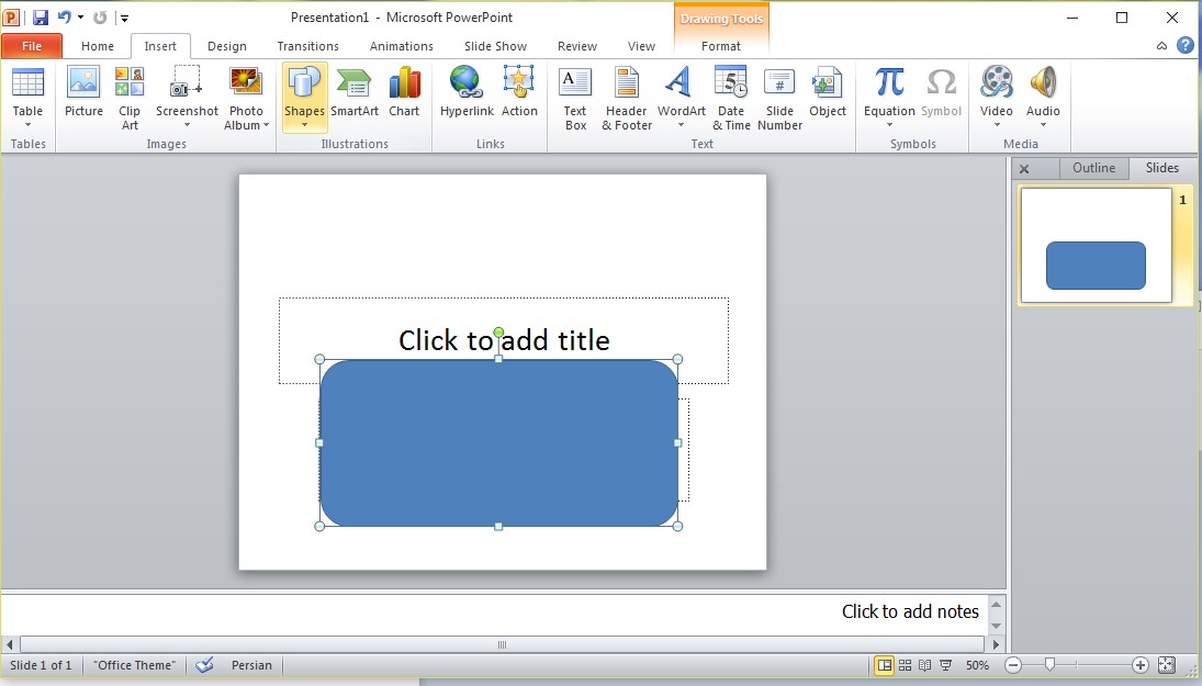با استفاده از قسمت Text Box هم می توانید متنی را به بخش خاصی از اسلاید اضافه کنید. اگر بر روی این گزینه کلیک کنید، می توانید در هر بخشی از اسلاید یک شکلی رسم کنید و در آن شکل، واژه یا متن مورد نظرتان را بنویسید.