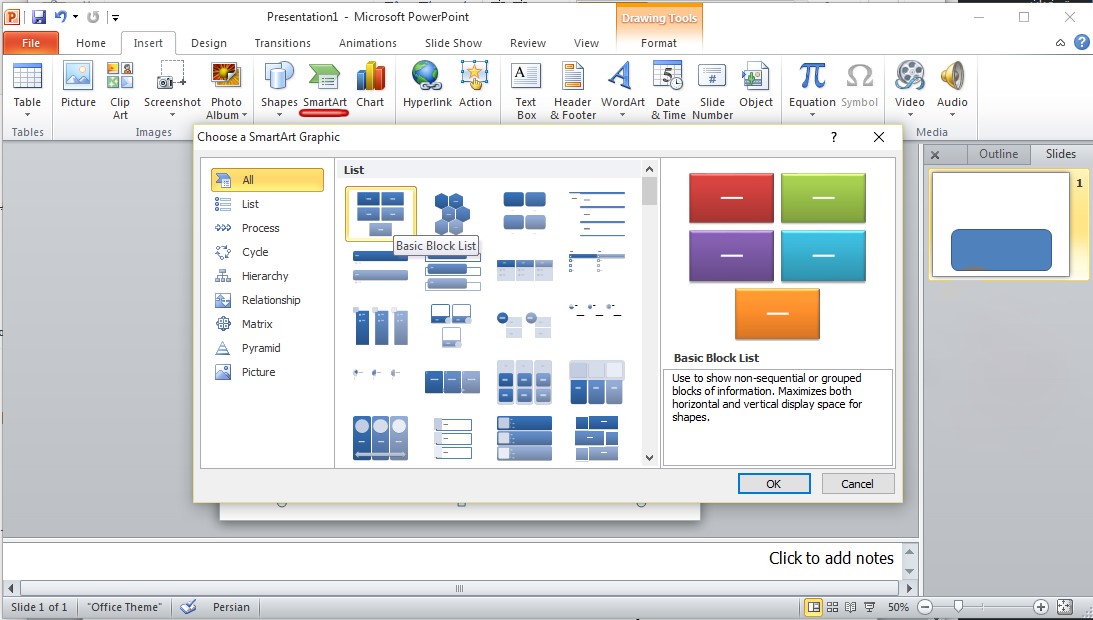 یکی از گزینه های بخش Illustrations در منوی Insert گزینهای است به نام Smart Art که قابلیت ایجاد یک لیست به صورت اشکال گرافیکی را دارد.