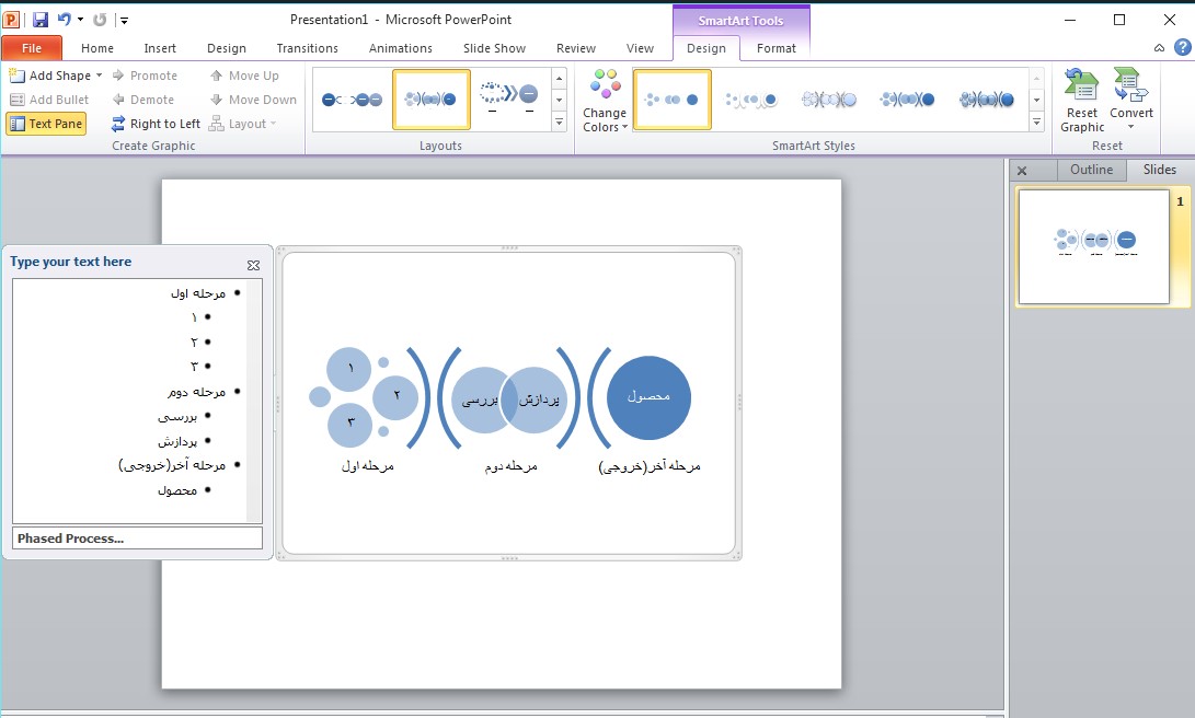 با درج هر کدام از این اشکال، می توان متن های مورد نظر را درون آن بخش ها تایپ کرد به عنوان نمونه، یک شکل از اشکال Process را انتخاب می کنیم: