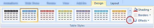 قالبها و رنگهای متنوعی را میتوانید از منوی Design برای جدول خود انتخاب و اعمال کنید. با کلیک بر روی فلشی که مشخص شده است میتوانید تمامی قالبها و رنگها را مشاهده و انتخاب کنید. همچنین اگر مکان نمای ماوس را بر روی طرح مورد نظر ببرید (بدون اینکه کلیک کنید) پیش نمایش زنده طرح برای شما درون اسلاید نمایش داده میشود.