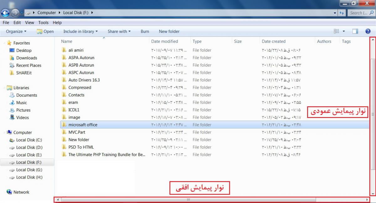 اگر محتویات پنجره ای زیاد باشد به گونه ای که تمام اطلاعات موجود در پنجره نمایش داده نشود موجب می شود نوار افقی در حاشیه پایین و نوار عمودی در حاشیه سمت راست پنجره مشاهده گردد. که با حرکت دادن هر کدام از نوار های پیمایش می توانیم تمام اطلاعات و مطالب موجود در پنجره را مشاهده کنیم. به این دو نوار به ترتیب نوار پیمایش افقی و نوار پیمایش عمودی نیز می گوییم