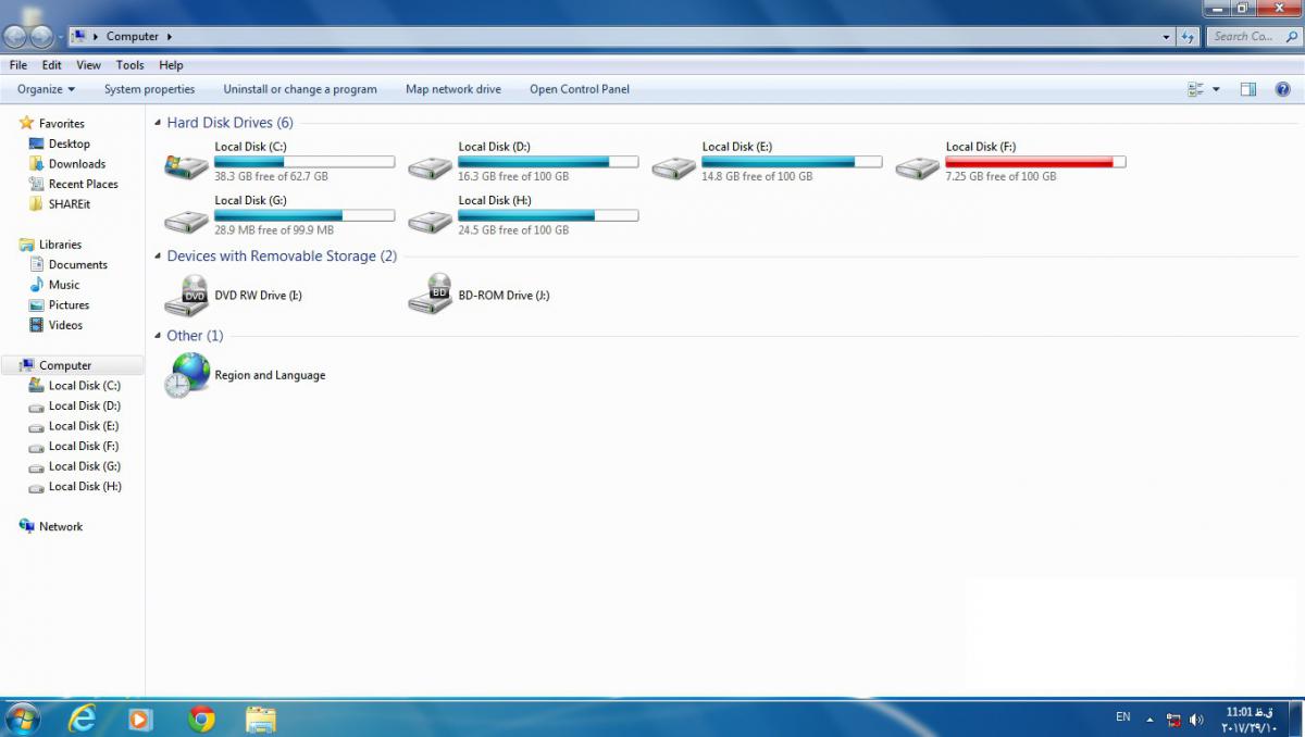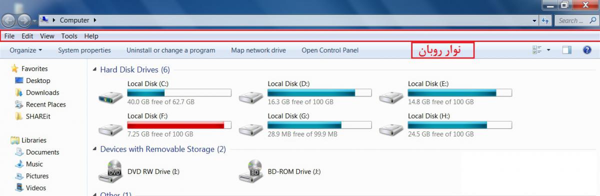 در ناحیه نوار روبان (Ribbon) اطلاعاتی از پنجره مورد نظر ثبت گردیده است. این ناحیه در پنجره های مختلف می تواند متفاوت باشد. به عنوان مثال در پنجره Computer نوار روبان دارای پنج سربرگ با عناوین File، Edite، View، Tools، Help نیز می باشد.