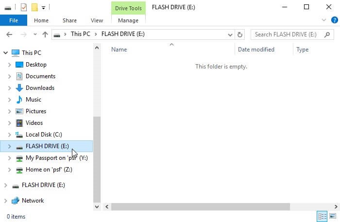 بعد از اینکه فلش مموری را به کامپیوتر متصل نمودید اگر پنجره ای که در تصویر بالا مشاهده مینماید ظاهر نشد. میتوانید از طریق پنجره File Explorer و در قسمت منوی سمت چپ بر روی درایو مروبط به فلش کلیک نمایید تا این پنجره ظاهر شود. توجه نمایید که ممکن است نام درایوی که مروبط به فلش مموری است متفاوت باشد.