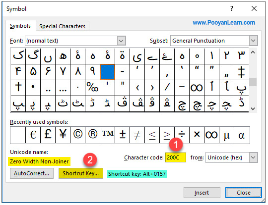 در قسمت Charachter code کد ۲۰۰C را وارد کنید. بعد از وارد کردن کد، کاراکتر نیمفاصله در بین Symbolها دیده میشود (کاراکتر بدون شکل-مربع خالی) در قسمت Unicode name هم نام آن با عنوان zero-width non-joiner مشاهده میشود که کلید میانبر پیشفرض آن هم Alt+0157 است. در تصویر آن را هایلایت آبی کردهام
