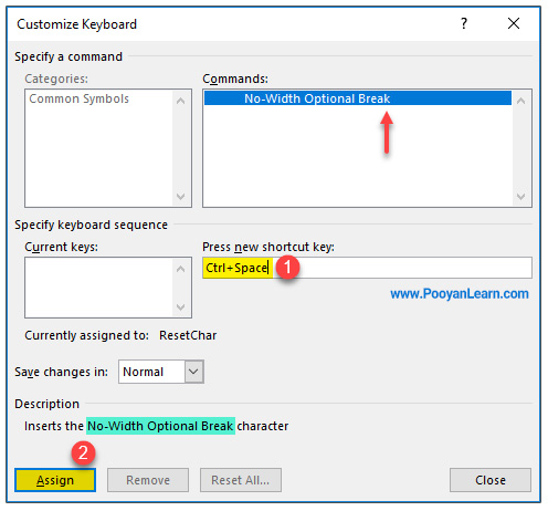 حالا روی Assign کلیک کنید تا کلید میانبر برای کاراکتر ثبت شود.