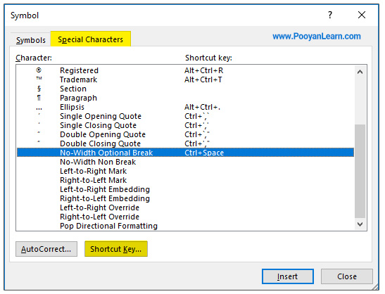 Special characters کلیک کنید، نام این کاراکتر را در لیست کاراکترهای خاص میتوانید مشاهده کنید. در همین پنجره هم اگر روی