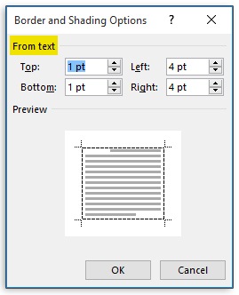 با انتخاب Paragraph دکمهی Options فعال میشود. پنجرهی Border and shading options باز میشود. می توانید با استفاده از قسمت Format text فاصله حاشیه تا متن را از بالا و پایین و چپ و راست تنظیم کنید.