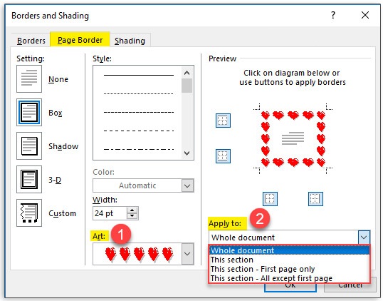 لیست کشویی Art در سربرگ Page Borders اضافه شده است که این لیست کشویی شامل یکسری حاشیههای هنری و فانتزی است.