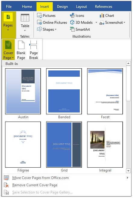 Insert کلیک کنید. میتوانید از الگویهای آماده نرمافزار ورد استفاده کنید. وقتی روی یک الگوی پیشفرض کلیک کنید، به عنوان اولین صفحه از سند شما قرار میگیرد