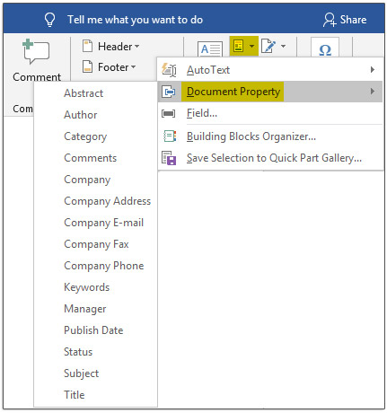 Quick Parts استفاده کنید تا اطلاعات موردنظر را به سند اضافه کنید. برای انجام این کار، به سربرگ