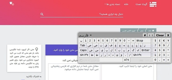 شما در سایت کیت ست تقریبا هر موردی را که نیاز به محاسبه داشته باشد می توانید پیدا کنید. مواردی مثل محاسبه تاریخ و زمان، تبدیل ها، انواع موارد مربوط به حوزه مالی و.. . اما یکی دیگر از امکانات مفید این سایت، کیبورد و فارسی نویس آنلاین آن است. با ورود به این صفحه دو باکس متنی در اختیار شما قرار می گیرد.