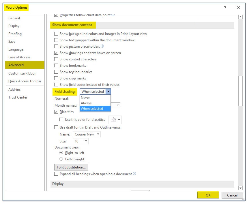 میتوانید فیلدها را در سند هایلایت کنید تا قابل مشاهدهتر شوند. برای این کار روی سربرگ