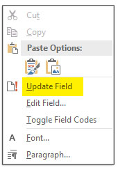 Word باید هنگام بازشدن یک سند، به طور خودکار فیلدها را به روز کند. بسیاری از قسمتها نیز هنگام پیش نمایش چاپ به صورت خودکار به روز میشوند. برای به روزکردن فیلدها به صورت دستی، روی فیلد راست کلیک کرده و سپس روی گزینه