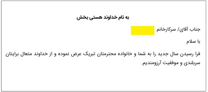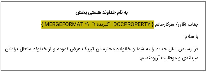 میخواهم یک نامه تبریک سال نو برای تعدادی از افراد ارسال کنم. برای اینکار ابتدا متن نامه را تایپ کرده و سپس در قسمت موردنظر که محل نام و نام خانوادگی افراد است، کلیک میکنم. (قسمت موردنظر را در تصویر زیر هایلایت کردهام