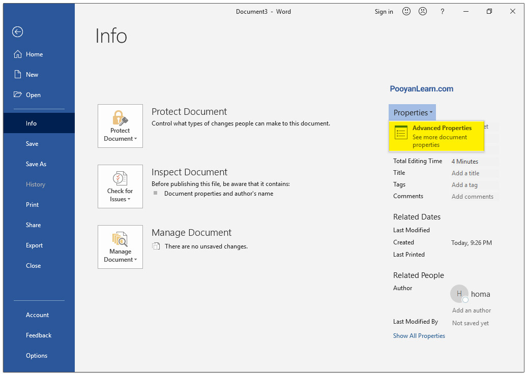 Properties وارد کردهاید، مشاهده خواهید کرد. حالا میخواهم نامه را برای گیرنده جدید بنویسم، لازم نیست نامه خود را از ابتدا تایپ کنم. فقط سندی را که برای آخرین گیرنده ایجاد کردهام باز میکنم. سپس به قسمت