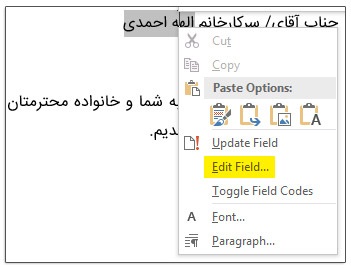 اگر در مقادیر فیلدهای دلخواه خود تغییراتی دادهاید، برای ویرایش آن مقادیر در سند، فقط باید روی فیلد کلیک راست کرده و روی