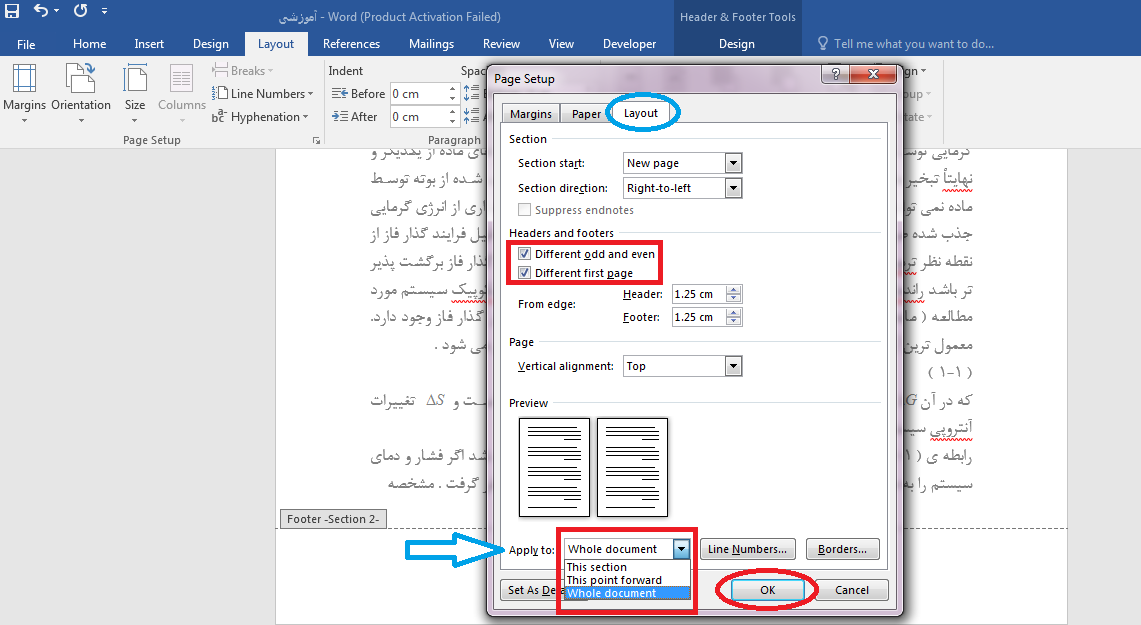 سپس در بخش Preview، Apply to را بر روی Whole document قرار دهید و در نهایت بر روی گزینه ی OK کلیک کنید. لازم به ذکر است اگر این تغییرات تنها برای یک فصل و یا بخش است کافی است تا این کادر را بر روی گزینه ی This section قرار دهید تا تغییرات فقط برای همین فصل مورد نظراعمال شود.