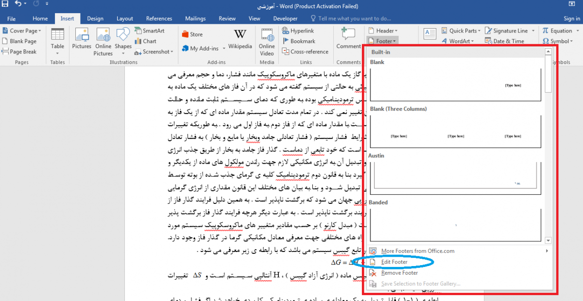 طبق تصویر مشاهده می کنید که پنل جدیدی باز می شود که شامل نمونه ها و الگوهای پیشنهادی نرم افزار ورد است. از بین نمونه های پیشنهادی می توانید یکی را مطابق با سلیقه ی خود انتخاب کنید یا با استفاده از گزینه ی Edit Footer تغییرات مورد نظر خود را اعمال کنید.