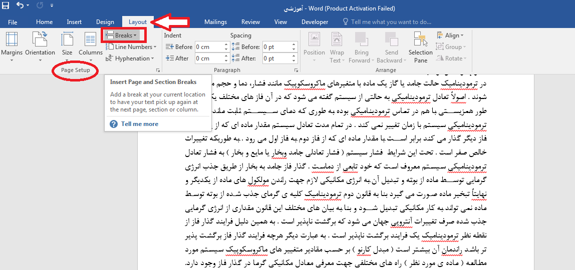ابتدا به صفحه ای که می خواهید در آن Footer متفاوتی داشته باشید بروید در انتهای صفحه کلیک کنید و از تب Layout وارد گروه Page Setup شوید و بر روی گزینه ی Breaks کلیک کنید.