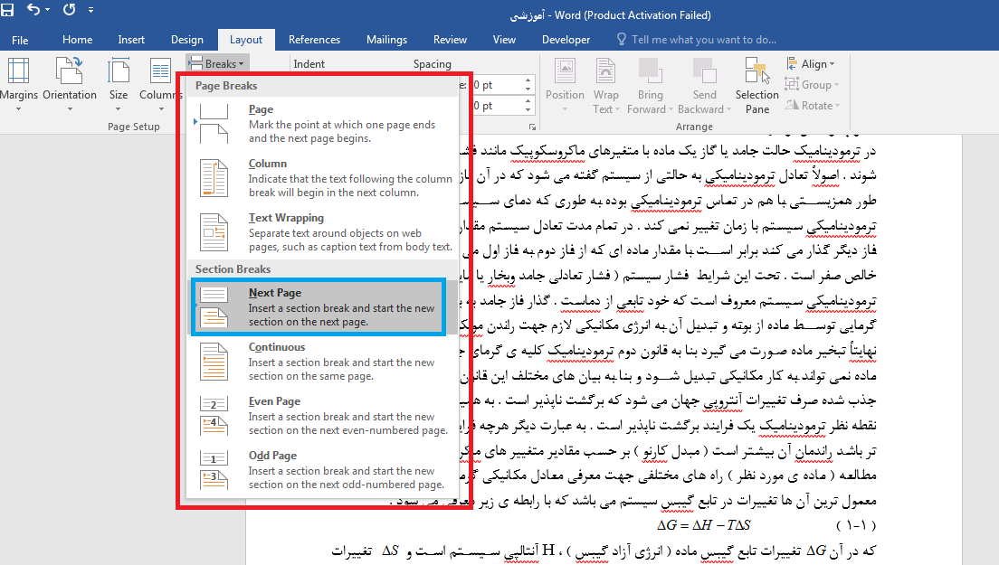 با کلیک بر روی گزینه ی Breaks پنل جدید برایتان باز می شود که در بین پیشنهاد های در دسترس باید بر روی گزینه ی Next Page کلیک کنید با این کار سکشن بندی برای شما انجام می شود.