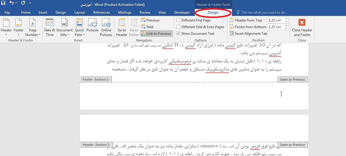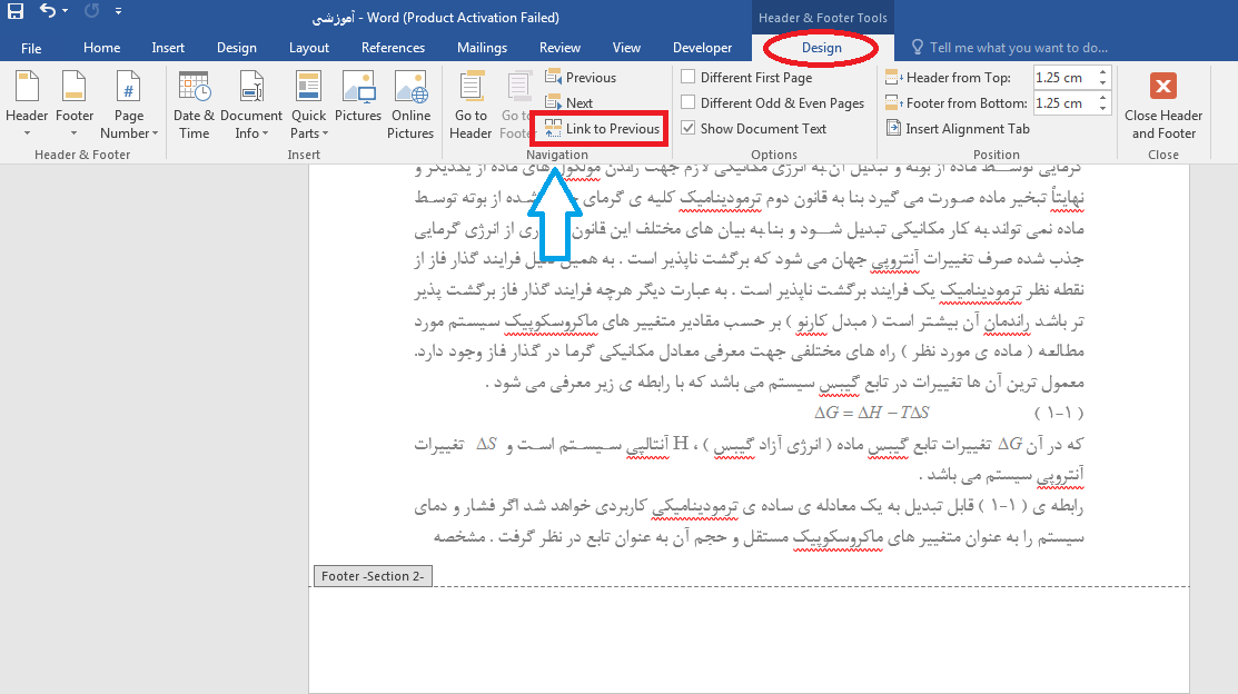 از تب Design وارد گروه Navigation میشود و گزینه ی Link to Previous را که در حالت انتخاب شده است را از حالت انتخاب تنها با دو کلیک پشت هم خارج می کنید با این کار اتصال بین دو سکشن را قطع و دو سکشن را از هم جدا می کنید. برای مثال بخش فهرست را از بخش مقدمه میتوان بدین صورت جدا کرد.