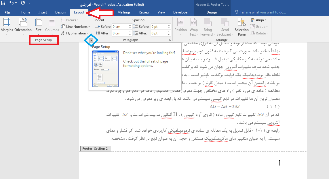 از تب Layout وارد گروه Page Setup شوید و بر روی مربع کوچکی که در کنار کادر قرار دارد کلیک کنید.