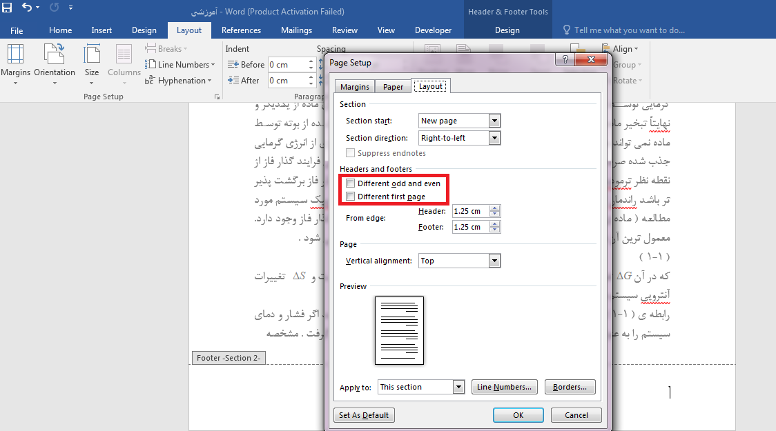 با کلیک بر روی این مربع یک پنجره ی جدید باز می شود، در این پنجره وارد سر برگ Layout شوید و به قسمت Header & Footer که دارای دو گزینه ی زیر می باشد، نوع تفاوتی که می خواهید را با زدن یا حذف تیک ایجاد کنید.