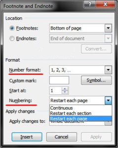 : Restart each section :انتخاب این گزینه باعث می شود که شماره گذاری از این صفحه تا آخرین پاورقی از عدد ۱ تا تعداد پارقی ها بدون قطع ادامه یابد یعنی ۱. ۲. ۳. ۴و