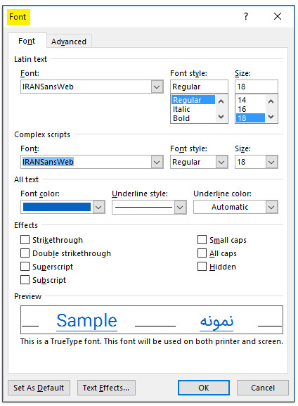Font باز میشود. میتوانید سبک فونت، اندازه و رنگ متن لینک و سایر تغییرات لازم را انجام دهید