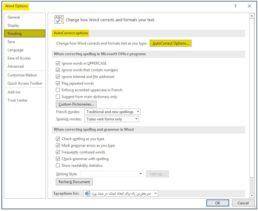 AutoCorrect باز میشود. سپس روی سربرگ