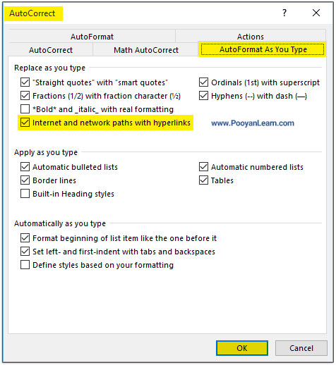 AutoFormat As You Type کلیک کنید. تیک گزینه