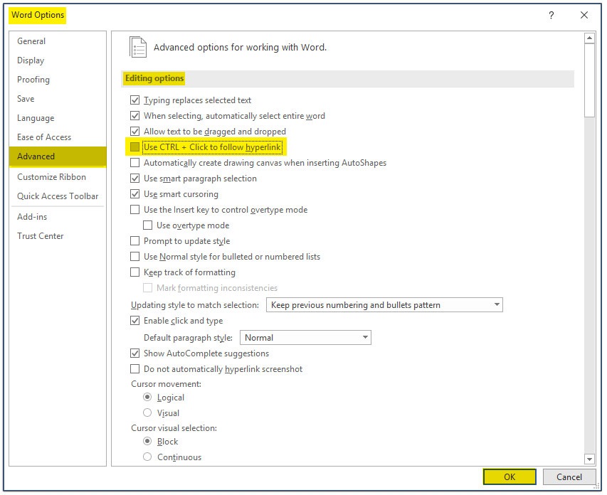 Use CTRL+Click to follow hyperlink را بردارید