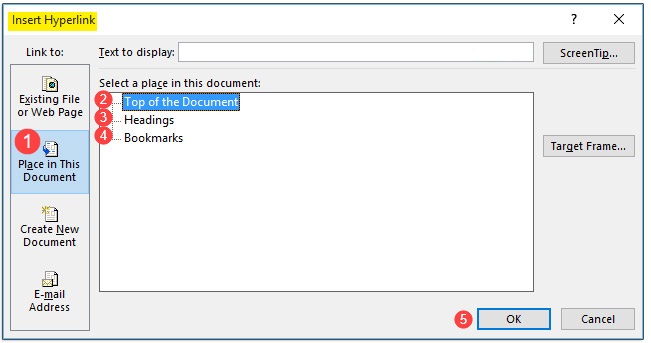 در کادر Select the place in the document، با انتخاب Top of the Document به بالای سند لینک داده میشوید؛