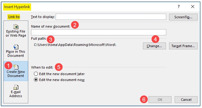 برای ایجاد یک سند جدید و خالی و لینک دادن به آن، در پنجره Insert Hyperlink و در قسمت Link to روی Create new Document کلیک کنید؛