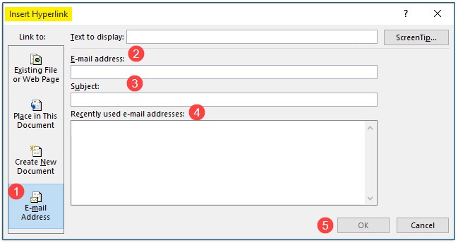 در پنجره Insert Hyperlink و در کادر Link To گزینه E-mail Address کلیک کنید؛