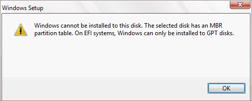 یکی دیگر از مشکلاتی که ممکن است حین نصب ویندوز و پارتیشن بندی رخ دهد مواجه شدن با ارور Windows cannot be installed to this disk. The selected disk has an MBR partition table. On EFI systems, Windows can only be installed to GPT disks است. در این ارور اعلام می شود که شما فقط می توانید ویندوز خود را روی دیسک های GPT نصب کنید پس به یک روند تبدیل دیسک نیاز دارید.