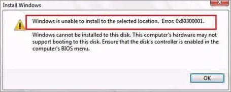 Windows is unable to install to the selected location. Error:” 0x80300001