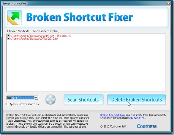 Broken Shortcut Fixer استفاده کنید که تمامی میانبر های معیوب را لیست می کند و هریک از فایل های معیوب را فیکس و سالم می کند.در همین لیست می توانید نسبت به حذف شورتکات ها نیز اقدام کنید