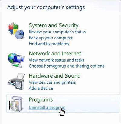 در بعضي موارد برنامههايي روي کامپیوتر نصب ميكنيد كه پس از مدتي مورد استفاده قرار نخواهند گرفت شما ميتوانيد اين برنامهها را از روي سيستم پاك كنيد توجه داشته باشيد كه براي حذف برنامهها از روي سيستم تنها پاك كردن آيكن مربوطه كافي نيست برنامه را به طور كامل Uninstall كنيد به اين منظور در پنجره Control panel و بخش Program گزينه Program Uninstall را كليك كنيد: