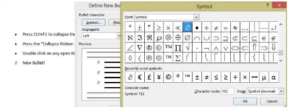 Define NewBullet > Symbol کلیک کرده و سپس هر نمادی را که برای سند خود مناسب می دانید را انتخاب کنید و یک