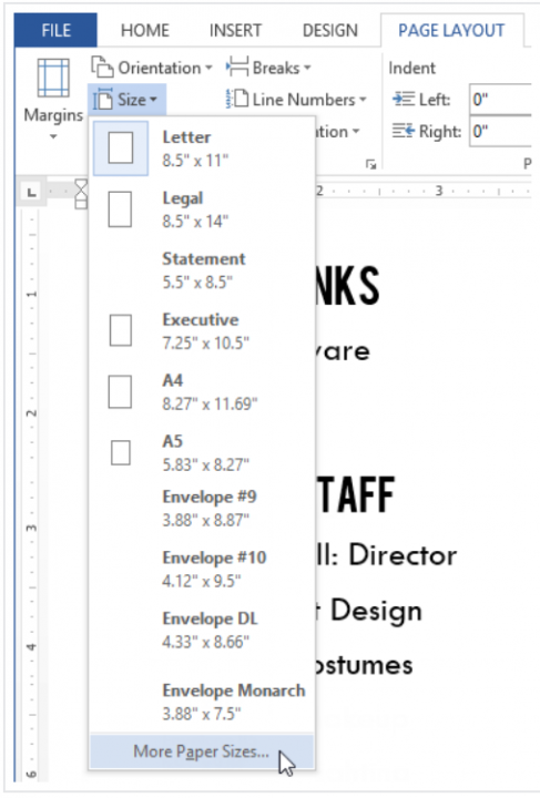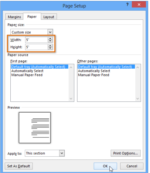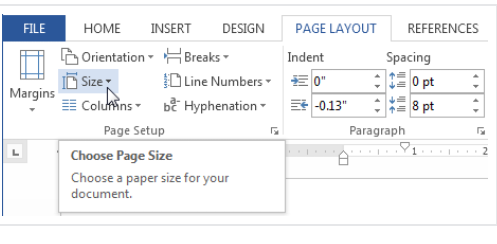 Page setup ورد همچنین به شما اجازه میدهد که سایز صفحه را سفارشی کنید
