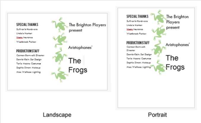 :افقی (Landscape) و عمودی(Portrait). در تصویر زیر یک مقایسه انجام داده ایم تا شما ببینید جهت صفحه چگونه میتواند در فاصله های متن و تصاویر تاثیر بگذارد