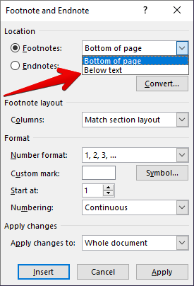“Footnotes” را پیدا کنید (هنگام باز کردن منو باید به طور پیش فرض انتخاب شده باشد). منوی کشویی در سمت راست آن گزینه را باز کنید سپس می توانید مکان پاورقی خود را یا به انتهای صفحه یا در زیر متن تغییر دهید. اگر گزینه دوم را انتخاب کنید، پاورقی های شما بلافاصله پس از متن اصلی، به جای انتهای صفحه قرار می گیرند