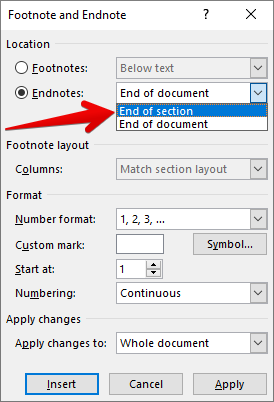“Endnotes” را انتخاب کرده و سپس منوی کشویی در سمت راست آن را باز کنید. در آنجا می توانید مکان قرار گیری ته نویس را به انتهای بخش فعلی یا انتهای سند تغییر دهید