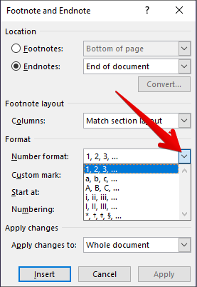 ورد همچنین به شما امکان می دهد برای قالب بندی شماره های پا ورقی ها و ته نویس ها از چندین گزینه استفاده کنید. به طور کلی ایده خوبی است که یک سیستم شماره گذاری متفاوت را برای هر نوع یادداشت انتخاب کنید، به خصوص اگر از ترکیبی پاورقی ها و ته نویس ها در سند استفاده می کنید. این به شما و خواننده کمک می کند تا به سرعت در یک نگاه بین این دو تفاوت قائل شوید